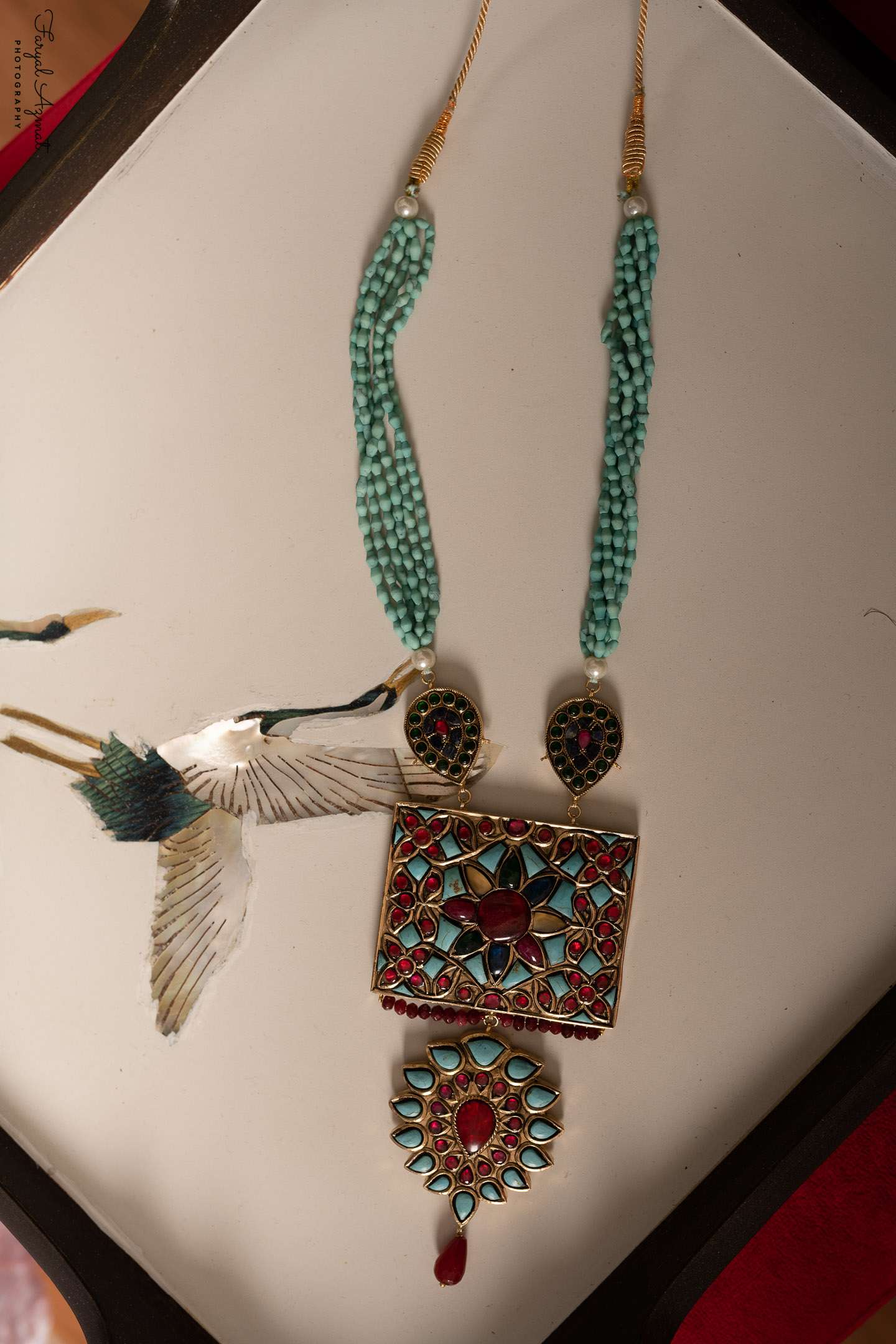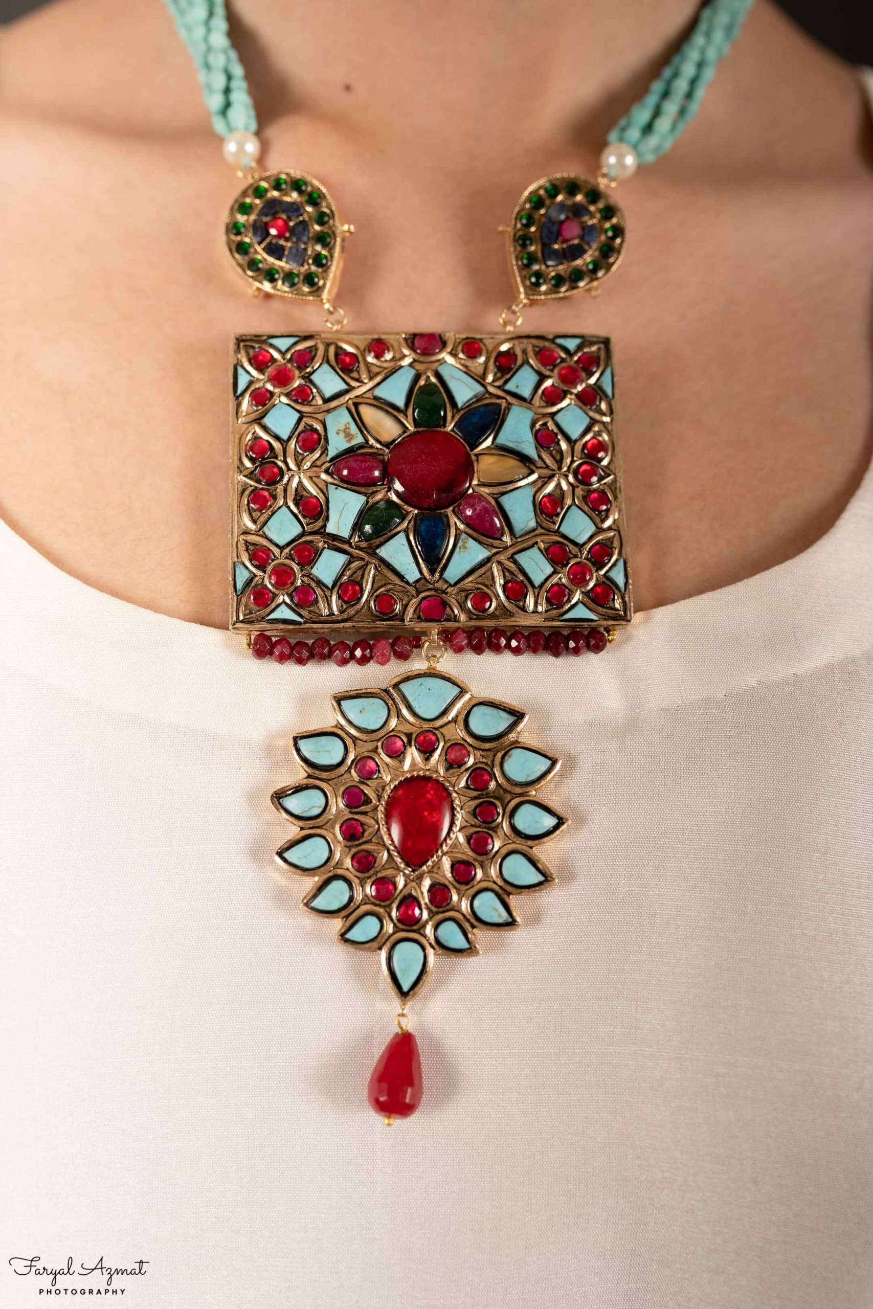 Adorn your neck with exquisitely designed square pendant in Firoza and Red Zircon with a dangling flower.