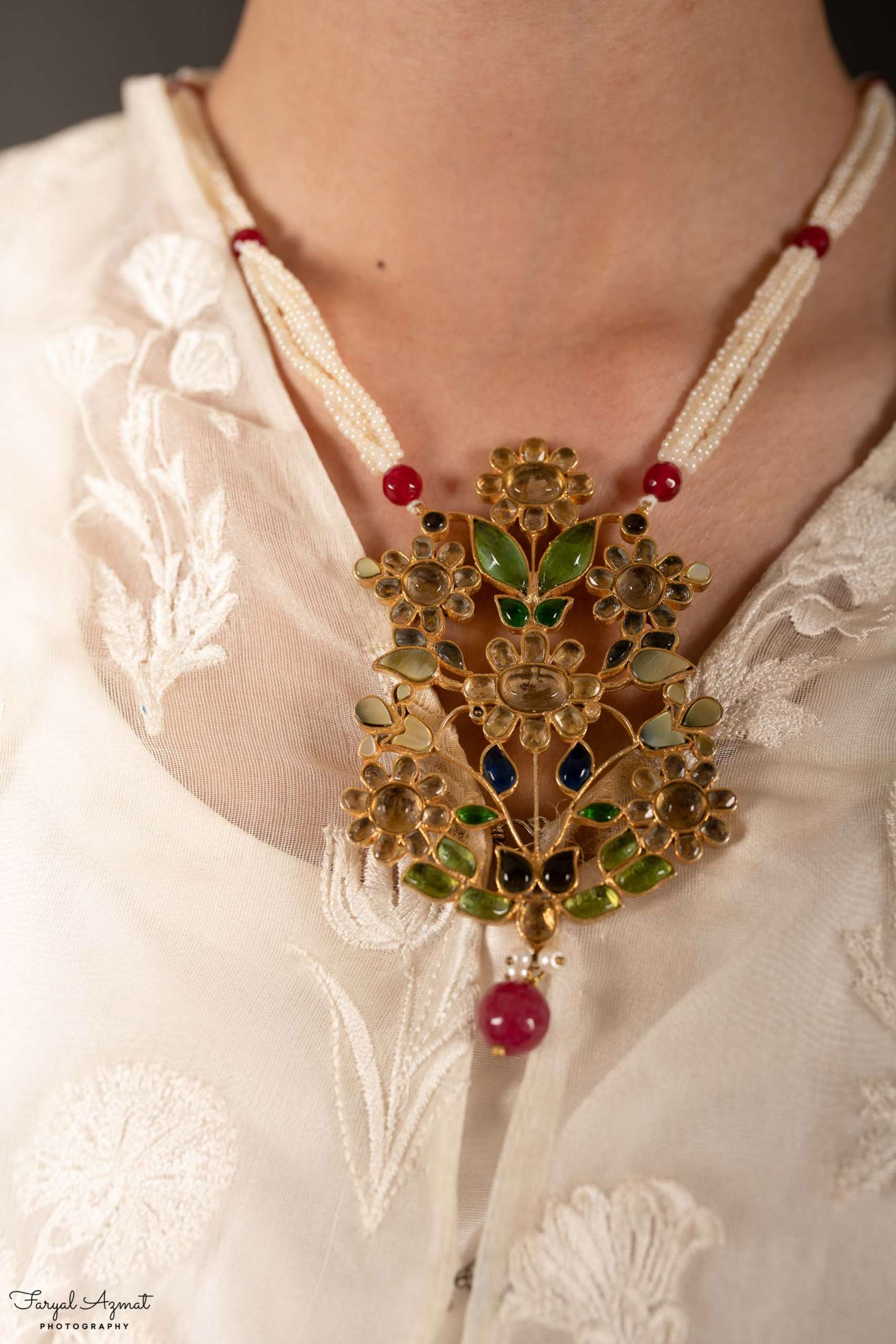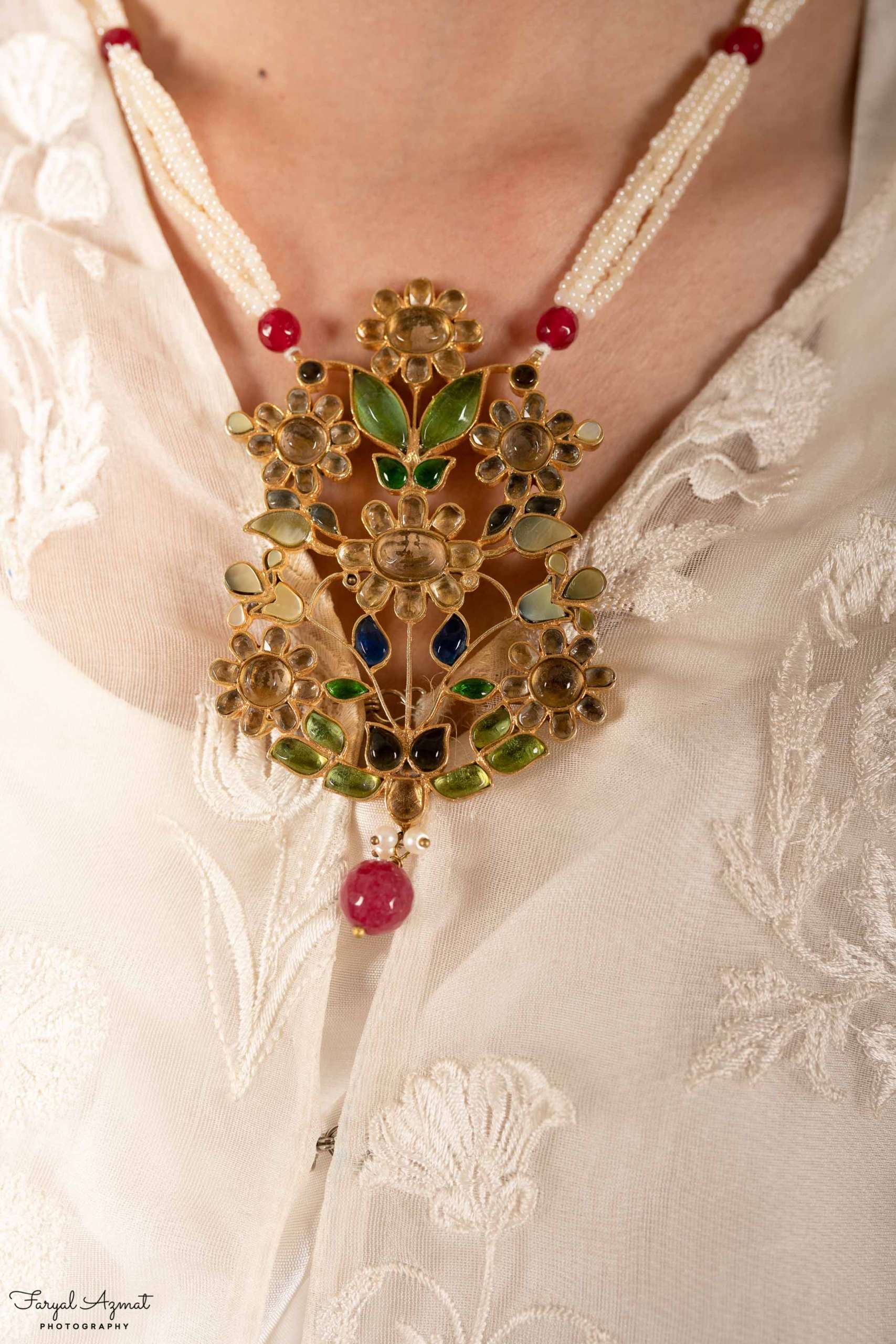 Feroza Necklace with pearl string & earrings