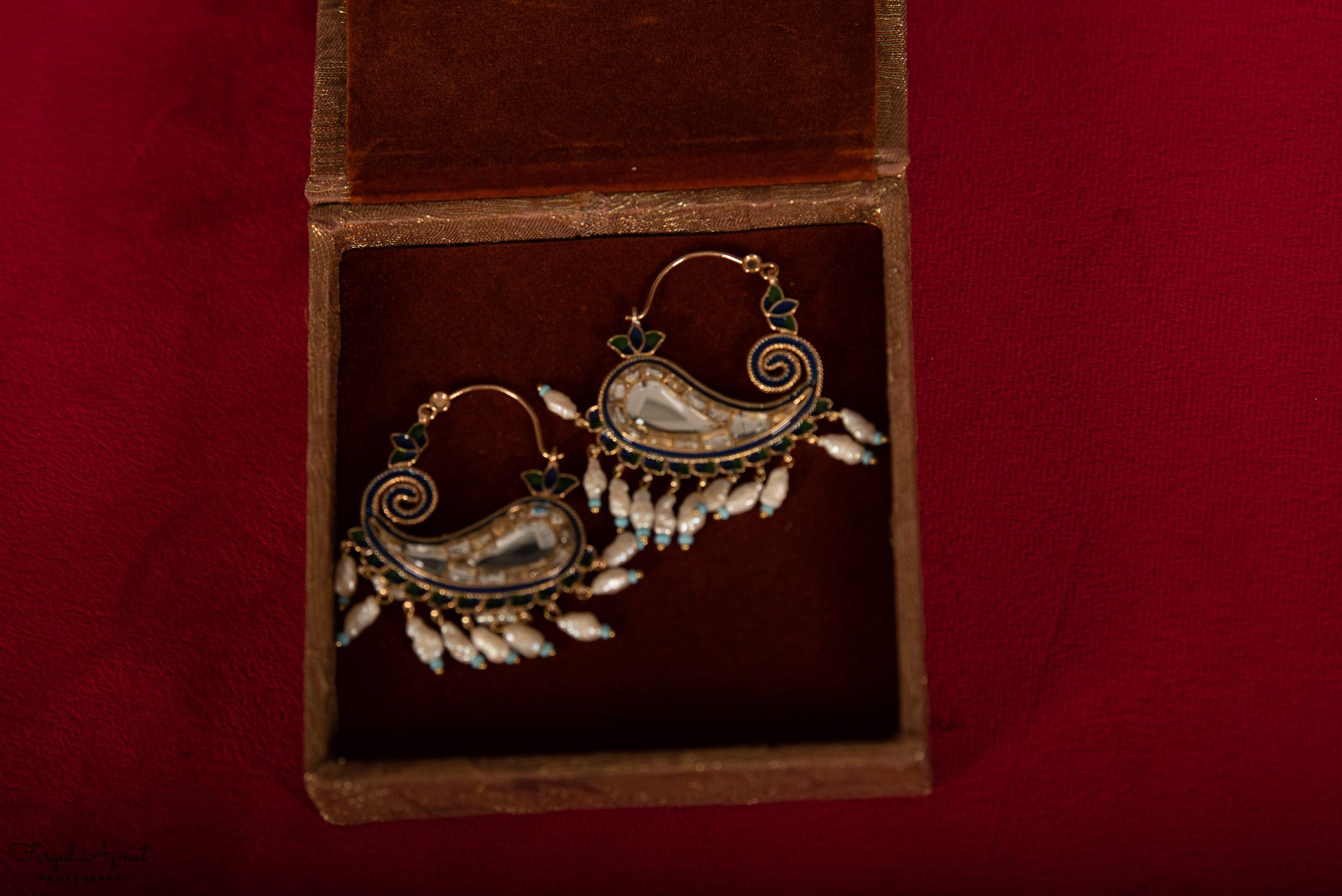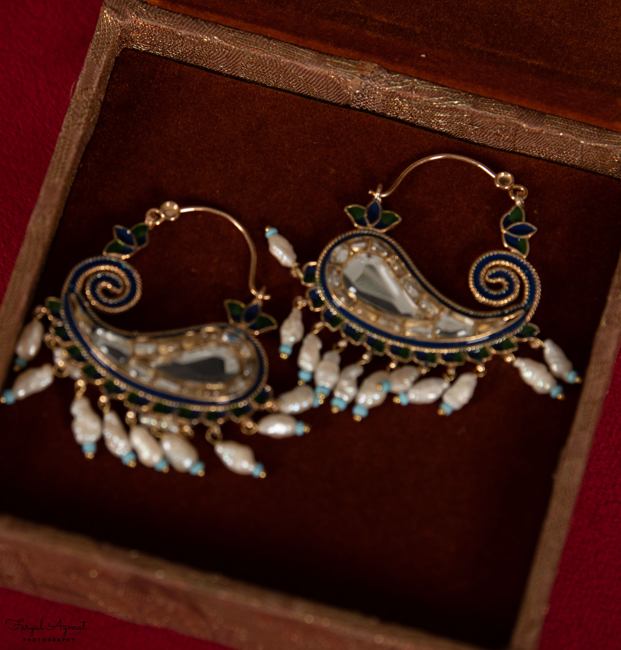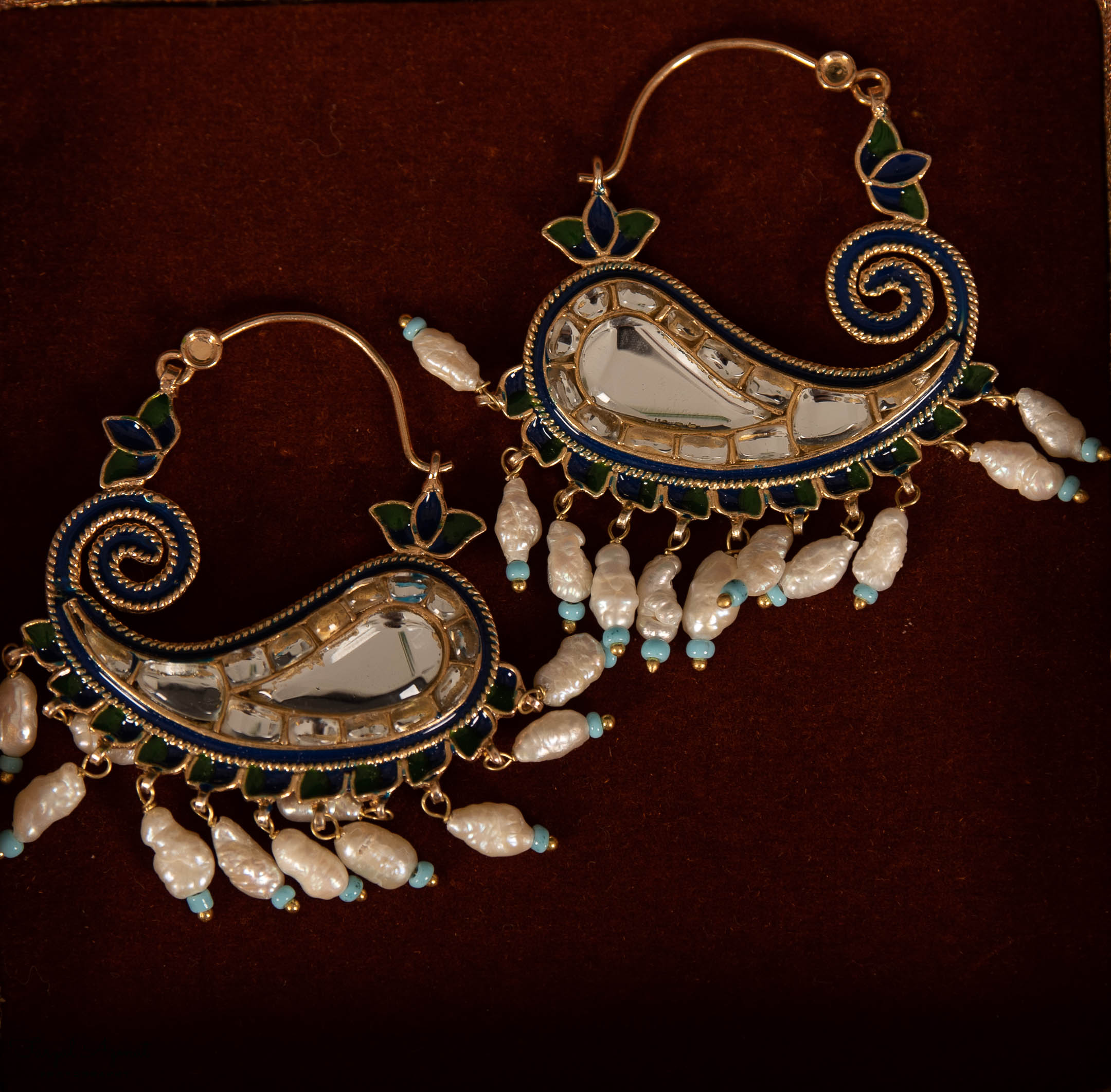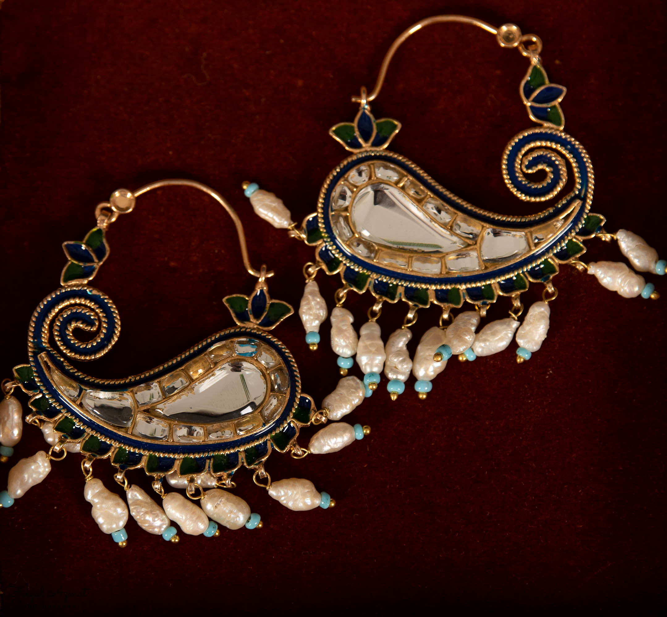 Intricately designed and crafted paisley earrings, with colorful stones of Ruby and Emerald, enhanced with pearl drops.