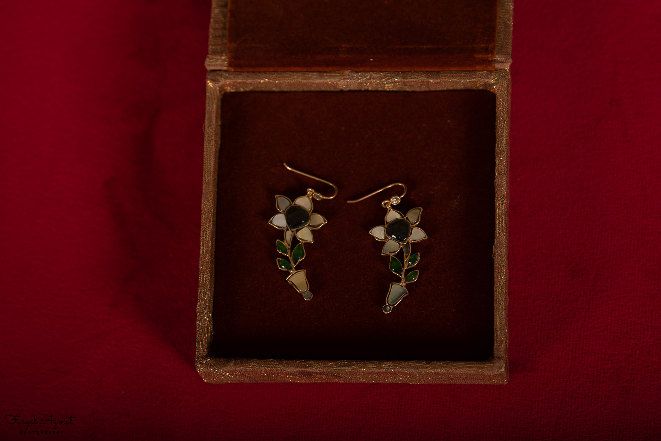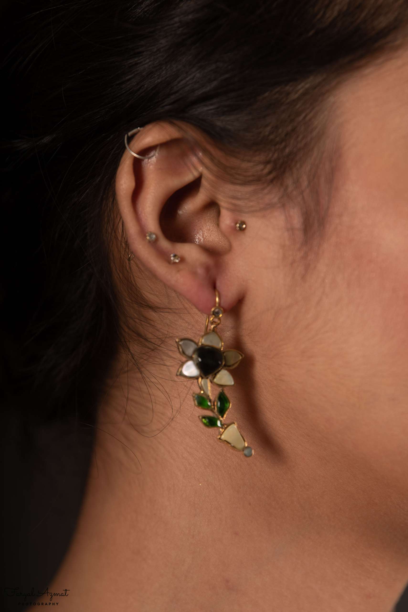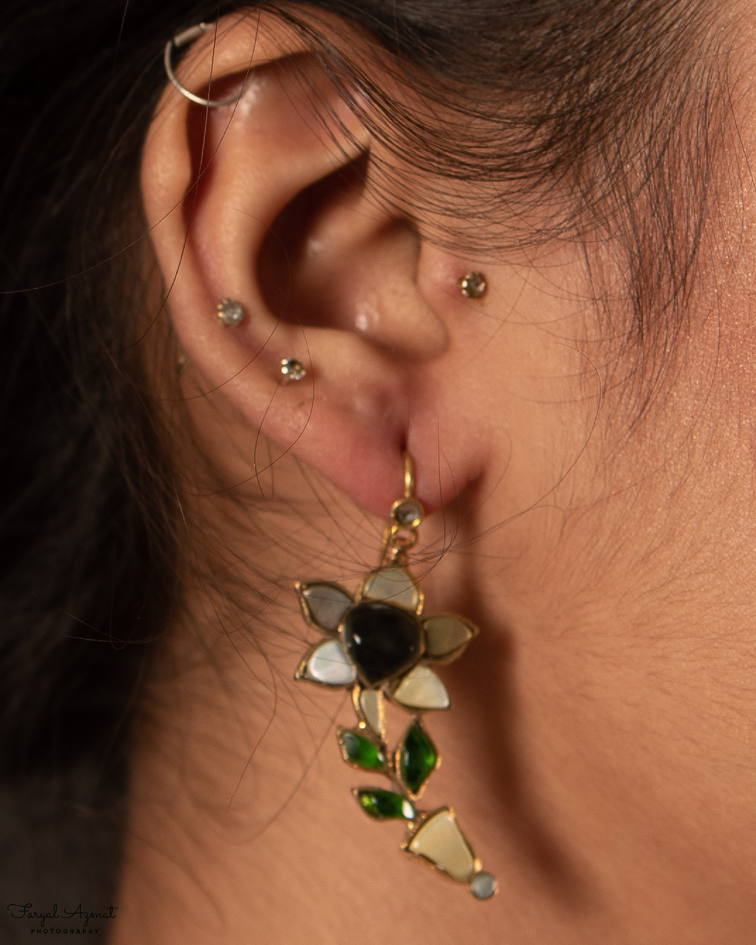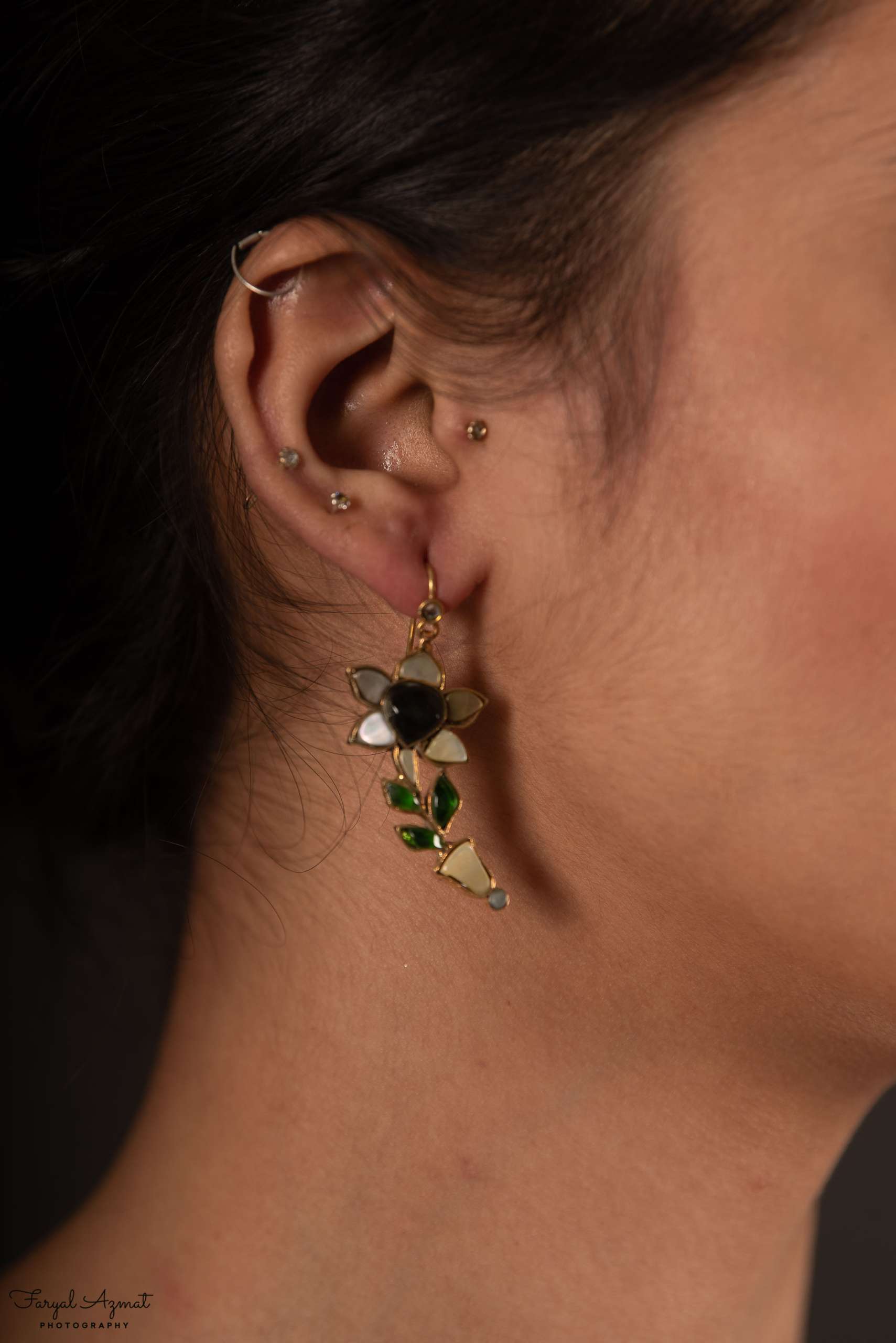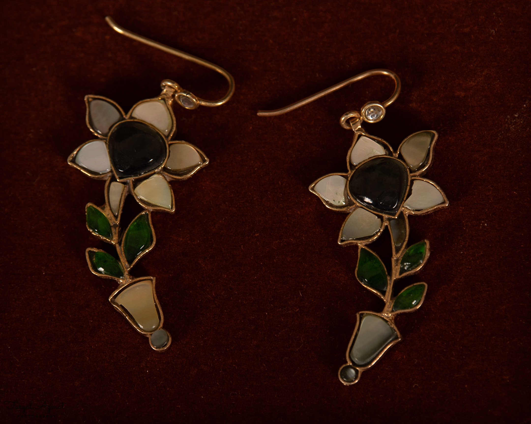 Seems spring is in the air. Adorn yourself with these lovely flowers in white and grey stones, with green leaves.