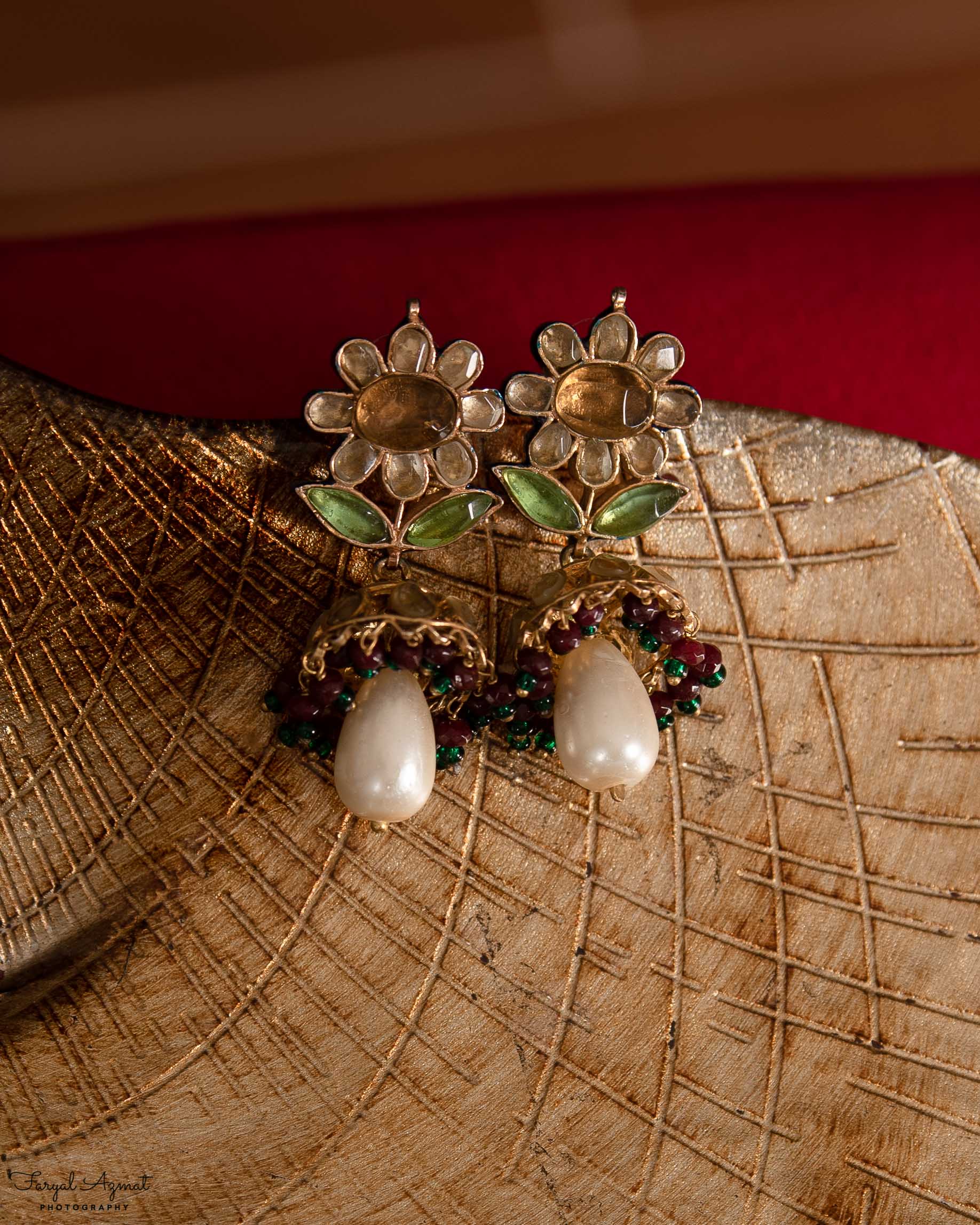 Featured here is a pair of contemporary floral earrings, gold plated and enhanced with rubies, topaz and pearl drops.