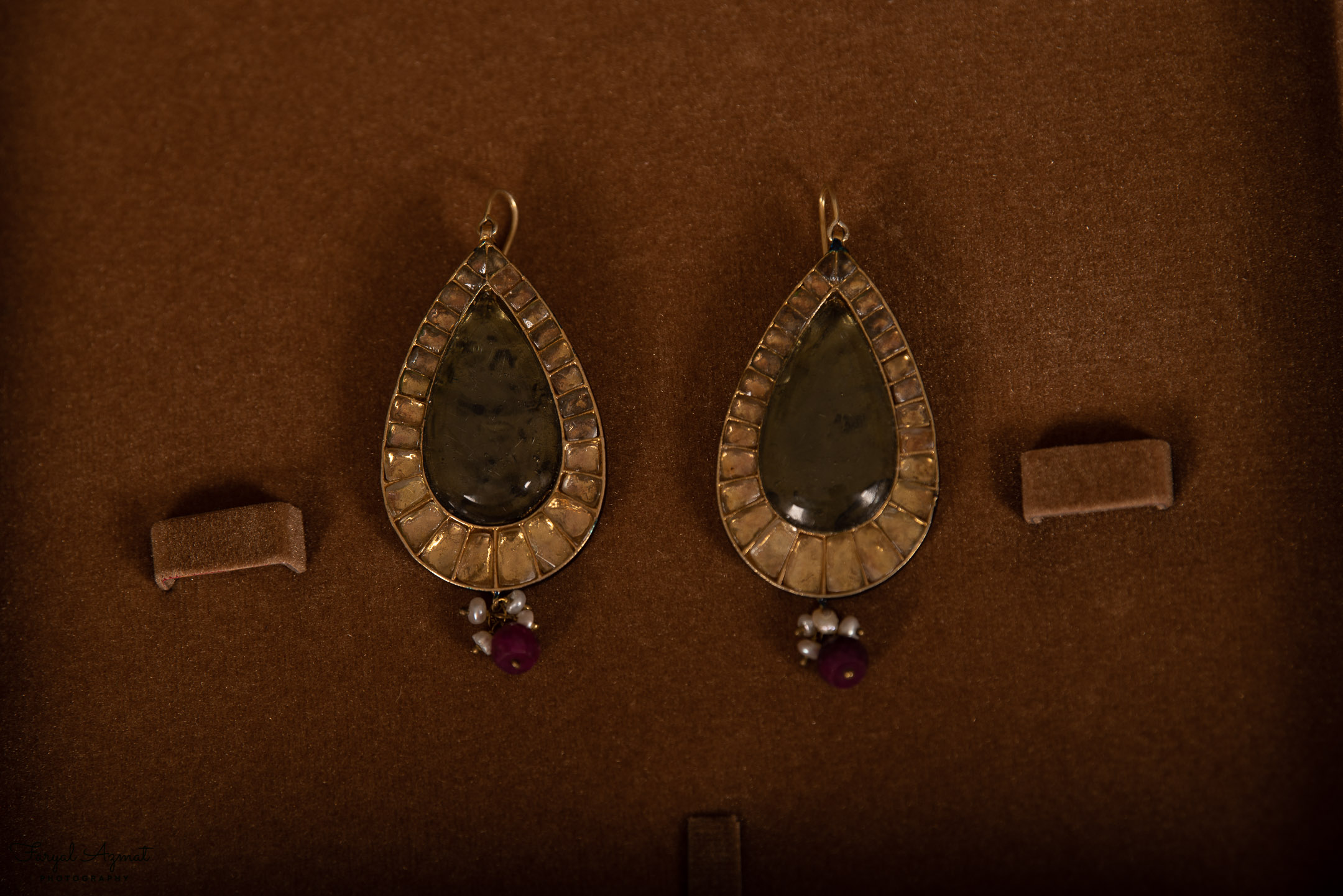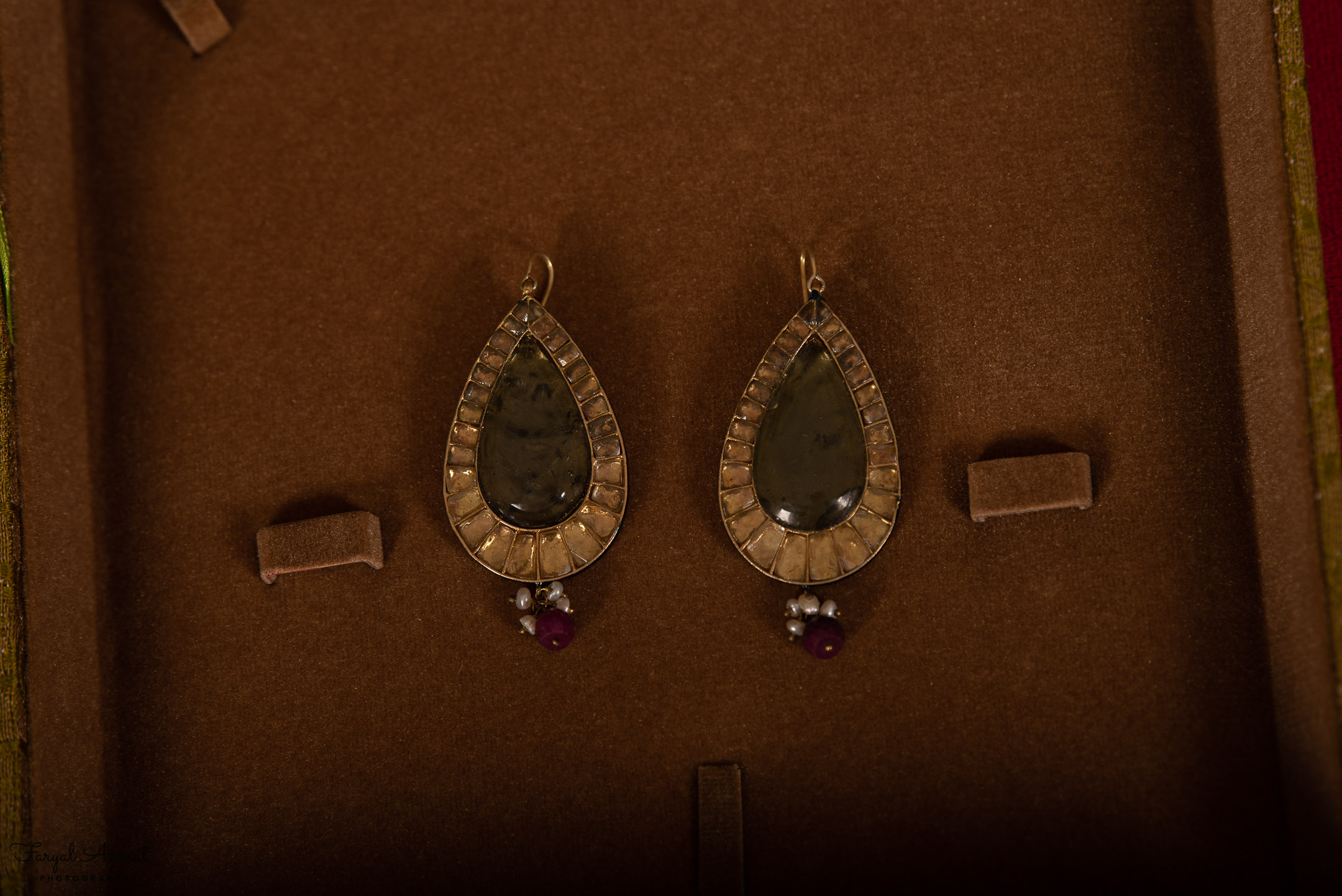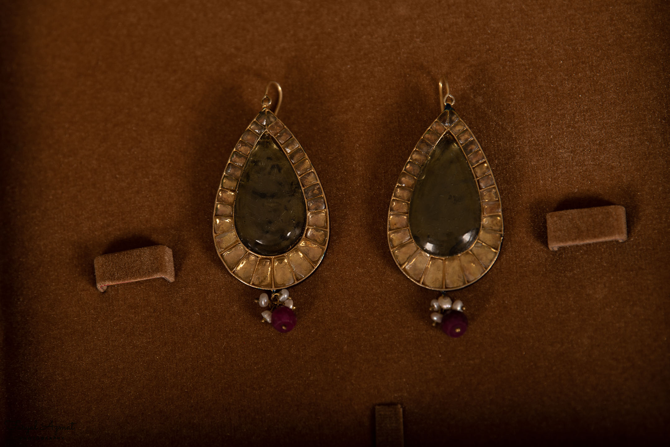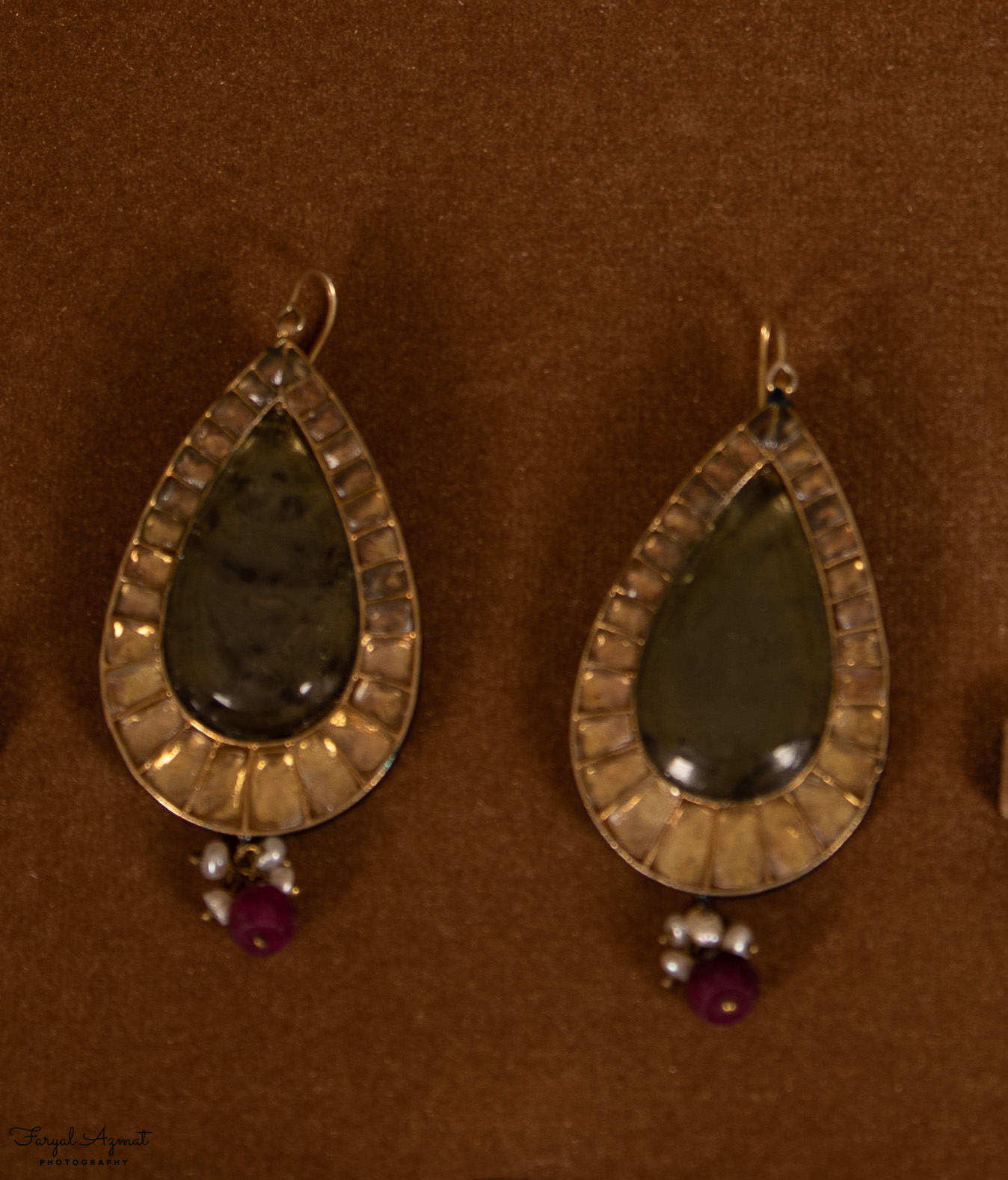 uniquely shaped dew drop earrings, set off with ruby drops and